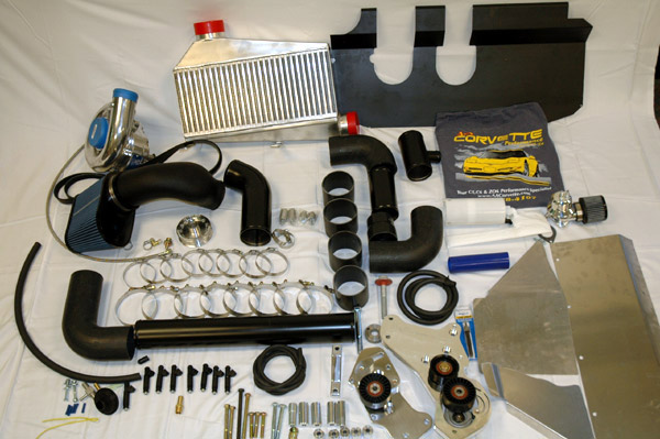 | This custom system was designed and refined, by A&A Corvette Performance for improved performance, reliability and simplicity. The Vortech S Trim or SC Trim head unit is used in conjunction with our custom made intercooler, bracket assembly and duct work. A new, larger air filter allows cool, unrestricted air to enter the supercharger. Our system also allows you to retain the factory dual cooling fans and brake ducts. The system is complete and includes 60lb/hr injectors, upgraded fuel pump, and upgraded billet blowoff valve (BOV). Larger superchargers such as the T Trim or YSI Trim head units are available for large CID forged engines. $5,995.00. Call now to order! |