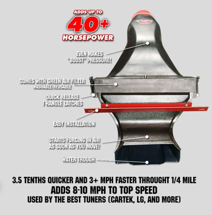 | The new VR-B2 unit is the third generation of our record setting VR-B2 system. This ram air system is over 110% efficient which allows the system to build manifold pressure at very low road speeds. This will improve acceleration which will lead decreased zero to 60 times as tested by Vette magazine. Our system will decrease you 1/4 mile times by 3/10ths - 1/2 second, Guaranteed! The VR-B2 features up to 40 HP throughout the RPM range! $369.95. Call now to order!